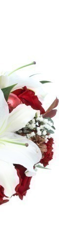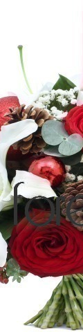 4 White Lilies, 6 Red Roses, Gypsophilia, 4 Red Baubles, 2 Pine Cones, 1 Red Candle